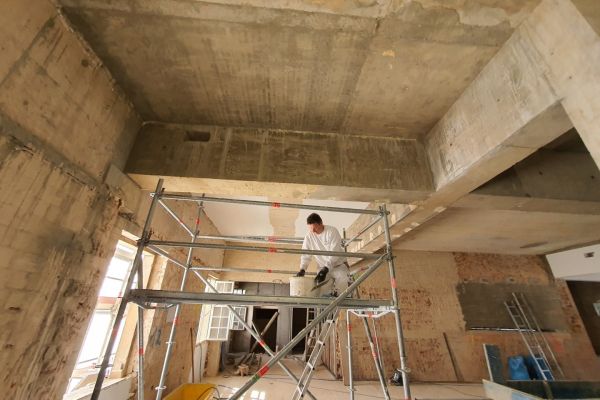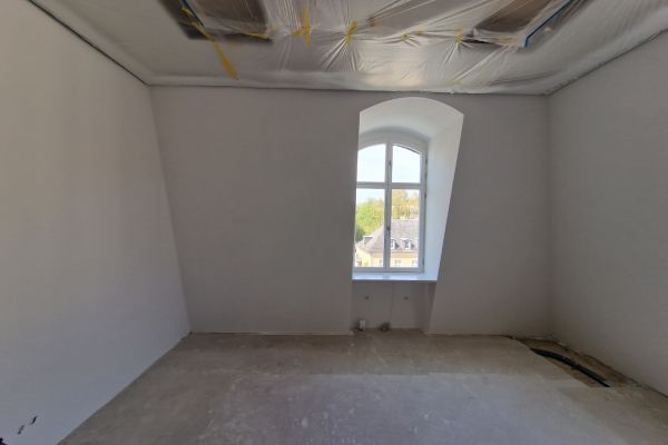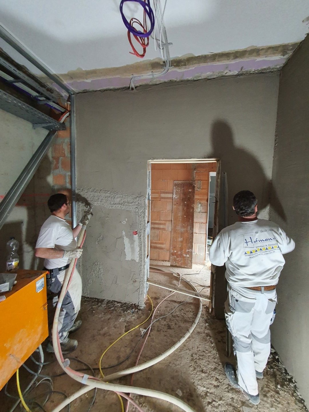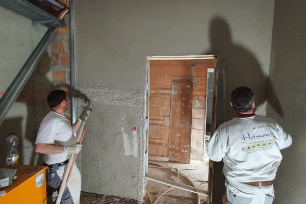 - mehrlagiger Kalkgrundputz an den Innenwänden und Betondecken