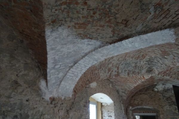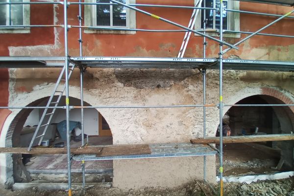 - Aufbringen eines reinen, handgemischten Sumpfkalkputzes als Grundputz mehrlagig, inklusive Spritzbewurf (im Sockel mit hydraulischen Zuschlägen wie NHL und Trasskalk) an den Fehlstellen, Rissen und abgenommenen Putzstellen