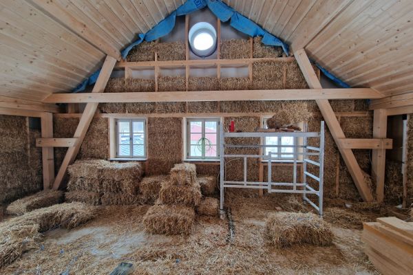 - Aufbringen eines rein mineralischen Lehmgrundputzes auf Strohballenwände, Strohbauplatten oder Bruchsteinmauerwerk